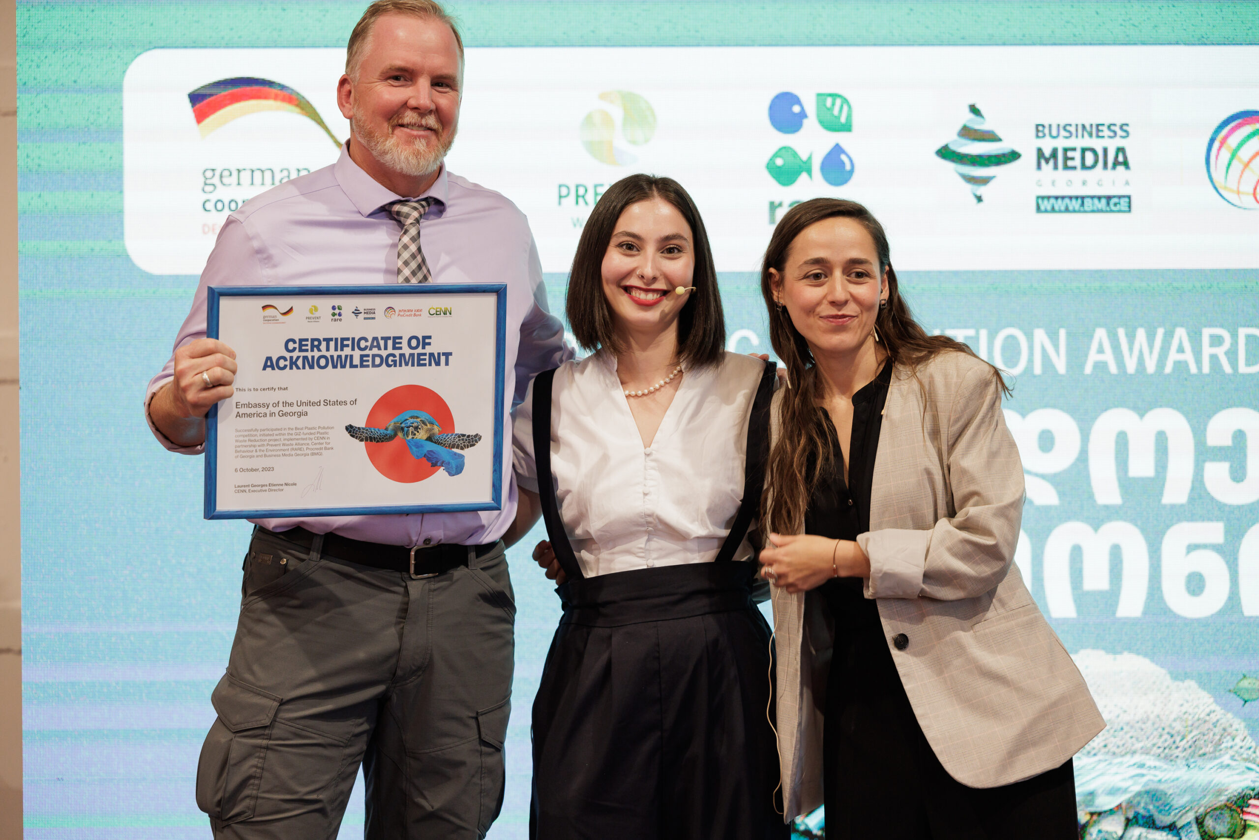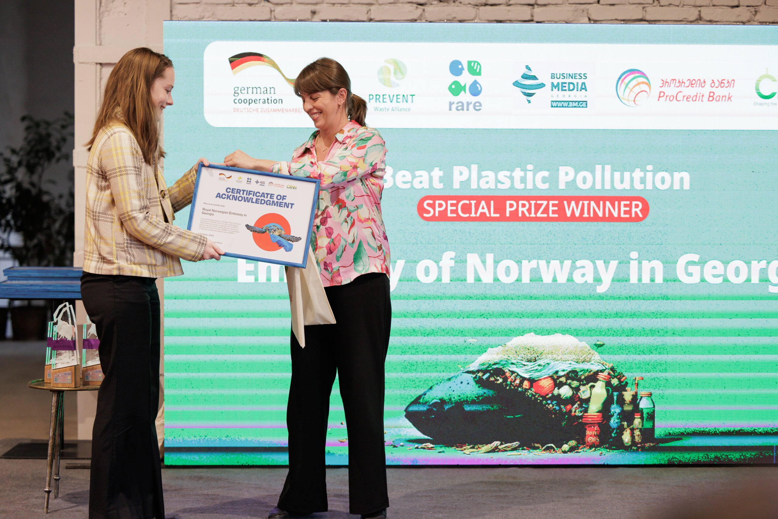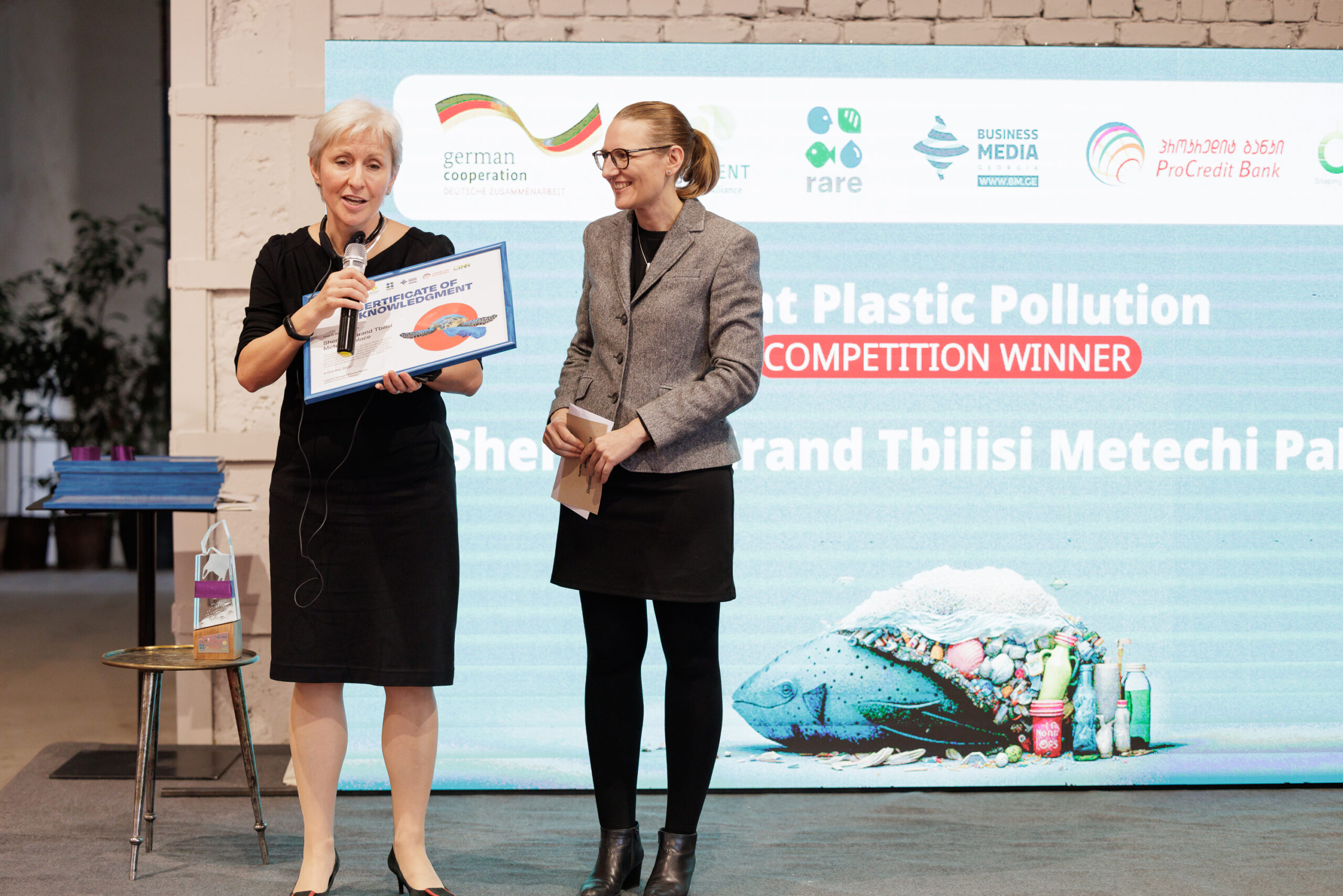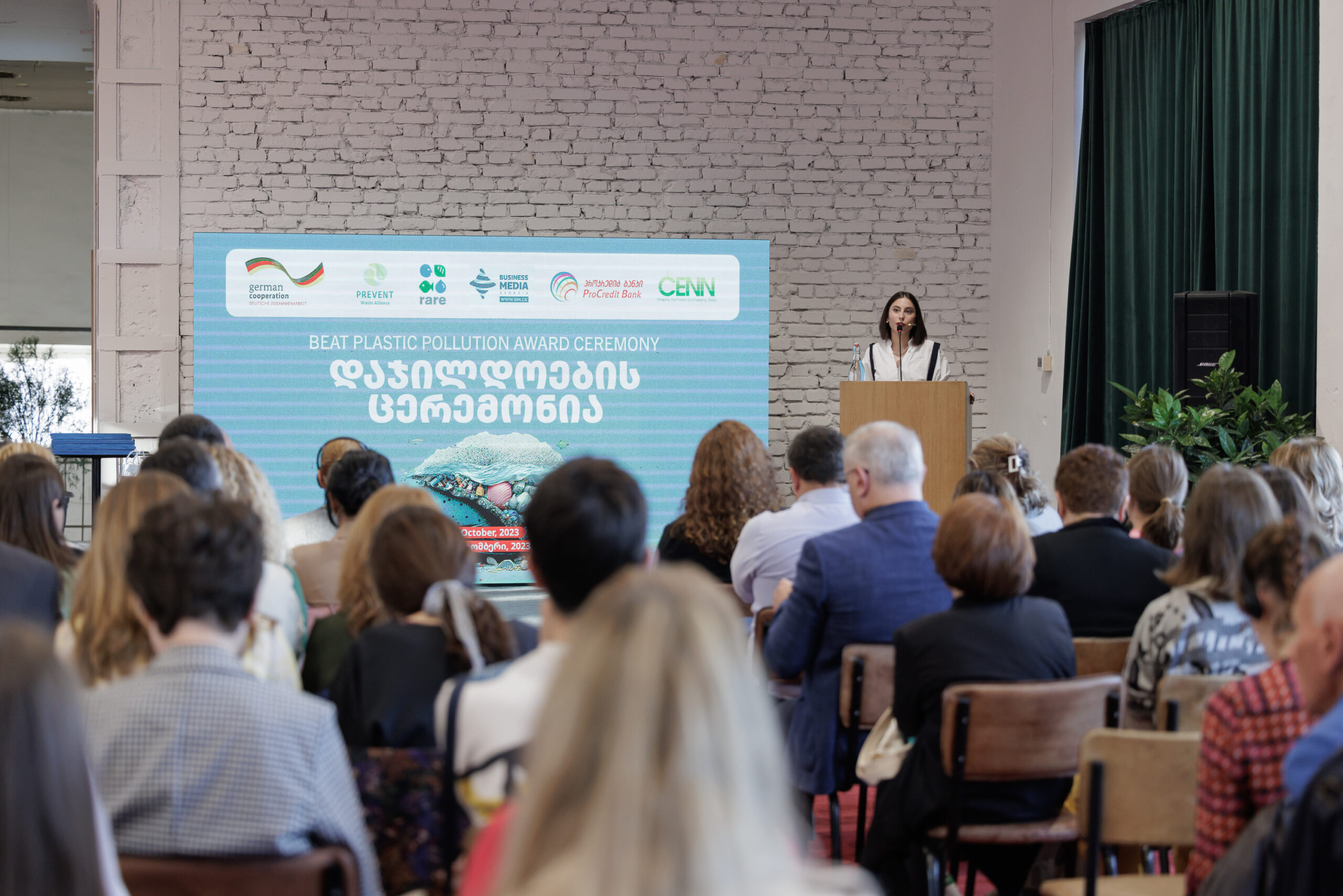 On October 6, at 16:30, in Stamba Hotel, CENN with support from the German Government through GIZ and together with partner organisations: Prevent Waste Alliance, RARE, ProCredit Bank and Business Media Georgia, held an award ceremony of the Beat Plastic Pollution Contest. The aim of the contest was to encourage businesses and organisation to establish green policies in order to reduce the generation of plastic waste.