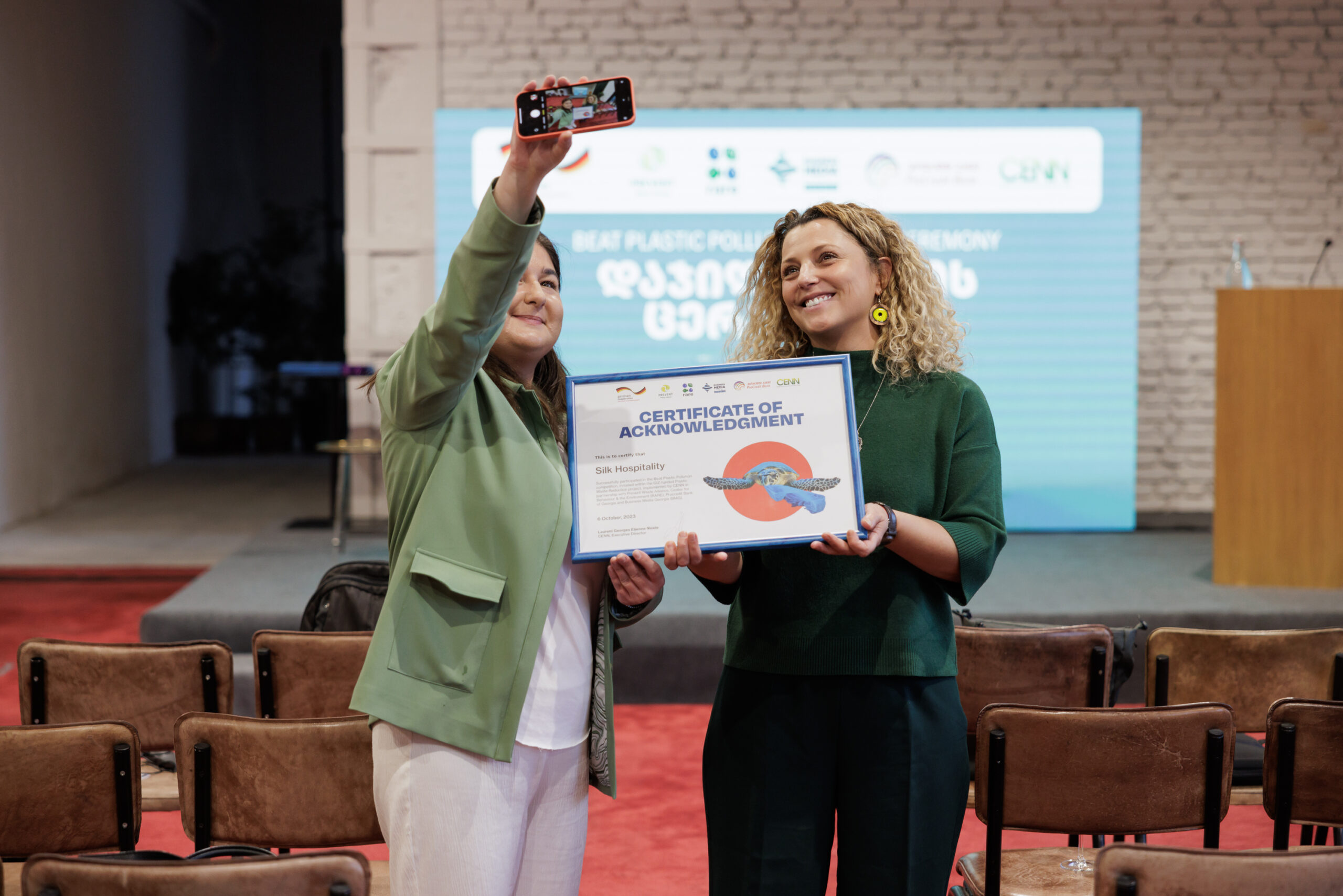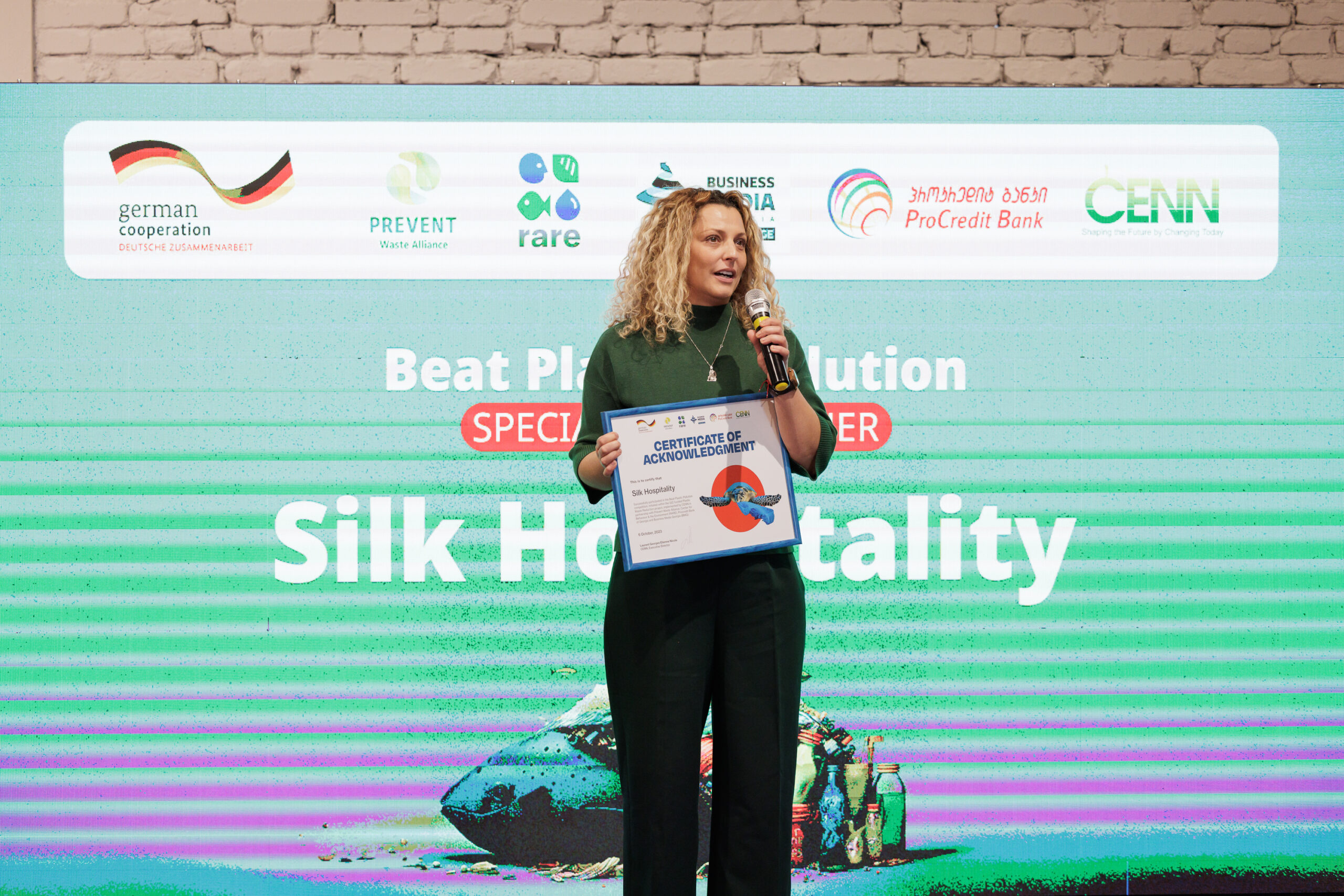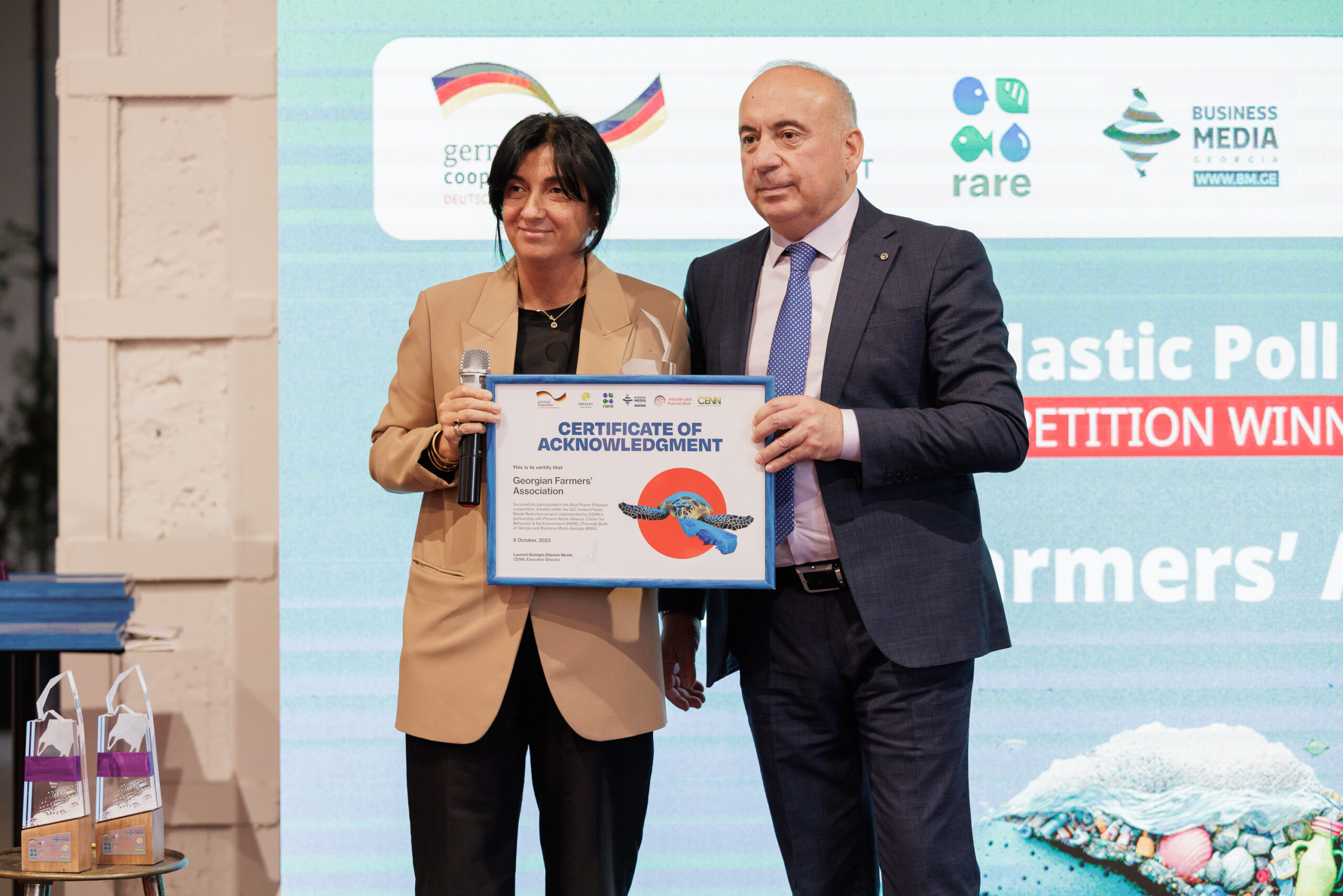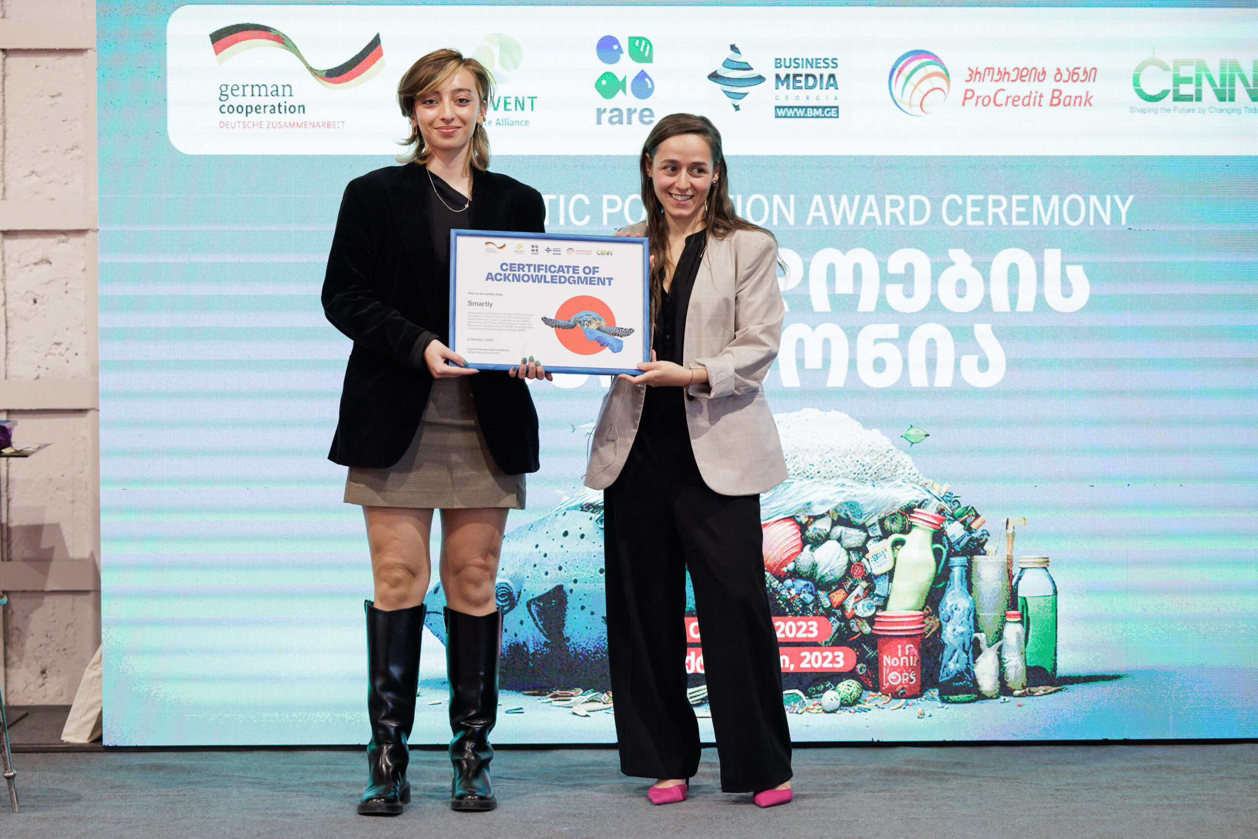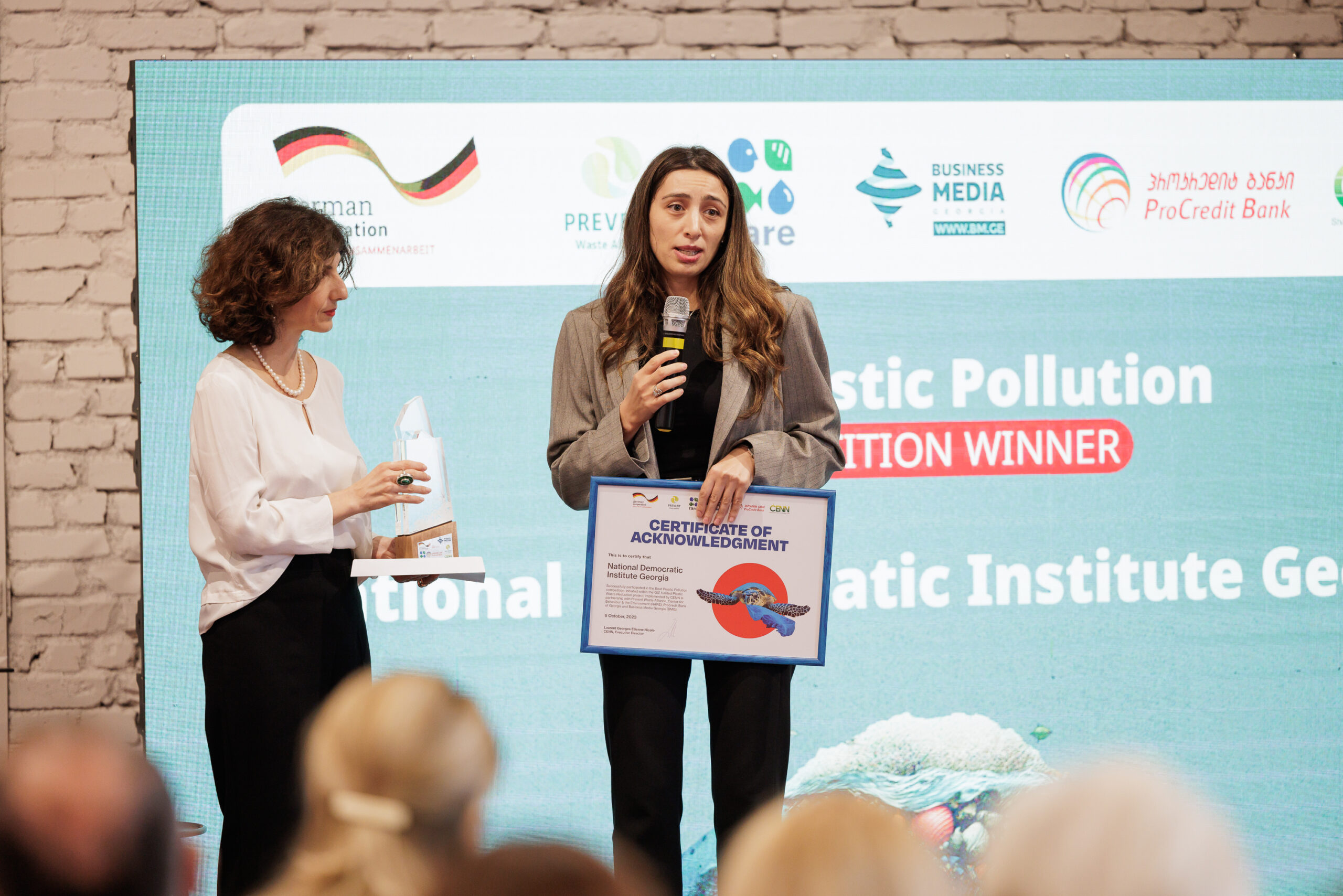 On October 6, at 16:30, in Stamba Hotel, CENN with support from the German Government through GIZ and together with partner organisations: Prevent Waste Alliance, RARE, ProCredit Bank and Business Media Georgia, held an award ceremony of the Beat Plastic Pollution Contest. The aim of the contest was to encourage businesses and organisation to establish green policies in order to reduce the generation of plastic waste.