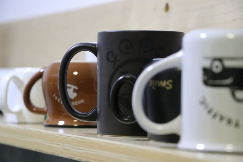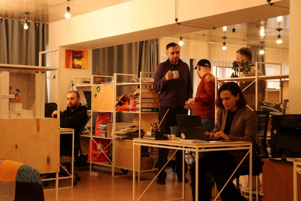 სამუშაო სივრცეს ერთმანეთისგან ხის თაროები ჰყოფს. თანამშრომლების მაგიდებზე ფერად-ფერადი კერამიკის ჭიქებიდან ცხელი ყავის ოხშივარი ადის.