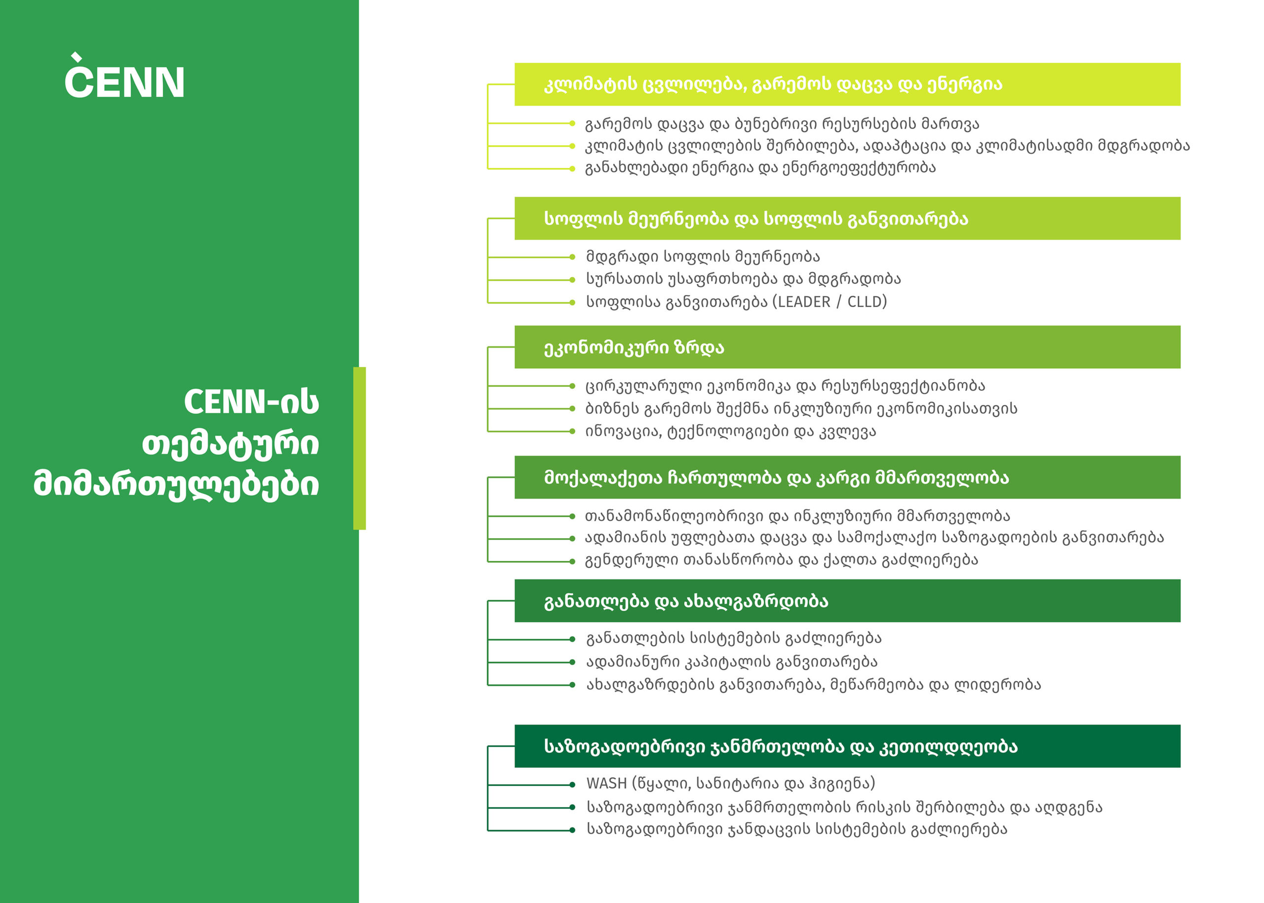 - ვითანამშრომლოთ ადგილობრივ თემებთან, აკადემიასთან და ბიზნესსექტორთან მდგრადი გადაწყვეტილებების შემუშავებისთვის, გარემოს დაცვისთვის, მწვანე ზრდის ხელშეწყობისა და ადამიანების ცხოვრების დონის გაუმჯობესებისათვის;
