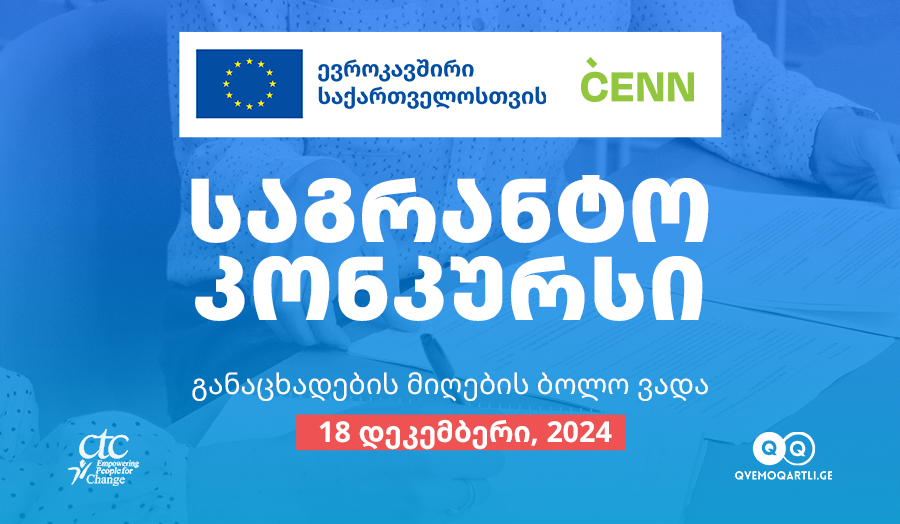 სიახლეებისაგრანტო კონკურსს სოციალური სერვისების გაუმჯობესებისთვისCENN, ევროკავშირის ფინანსური მხარდაჭერით მიმდინარე – „სამოქალაქო... ნოემბერი 25, 2024ვრცლად...